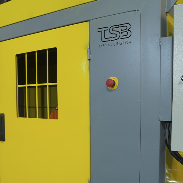 Painéis de segurança para fechamento de todo o equipamento, sendo algumas partes móveis/removíveis para manutenção e portas frontais articuladas, com dispositivo de segurança elétrico de parada de emergência em caso de abertura da mesma durante operação (NR12);